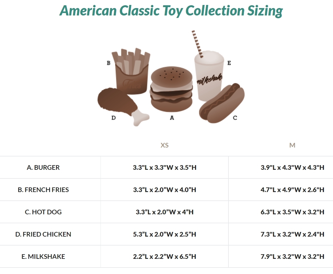 The American Classic Plush Toy Collection by P.L.A.Y. is for the foodie in your life! Who doesn't enjoy a scrumdiddlyumptious nom once in a while? Say goodbye to your Paleo diet and indulge your pup in the good ol' juicy burger, drumstick, and hot dog with a side of fries. Wash all that greasy goodness down with a milkshake!