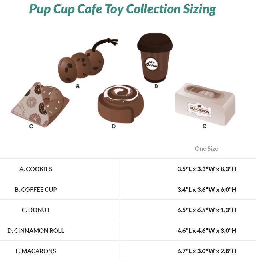 Fuel up for fun with P.L.A.Y.'s Pup Cup Café Plush Toy Collection, a full set of coffee shop themed toys for the energy-filled pup in your life. Dive into the swirls of a warm and flakey cinnamon roll toy for hours of unraveling fun, or spice it up with a fun sprinkled donut paired with their favorite go-to coffee beverage to wash it all down! As a lil snack for later, grab some classic chocolate chip cookies, connected by a rope perfect for tug-of-war or share some delectable macarons with furiends for a fancy game of Find-n-Seek.